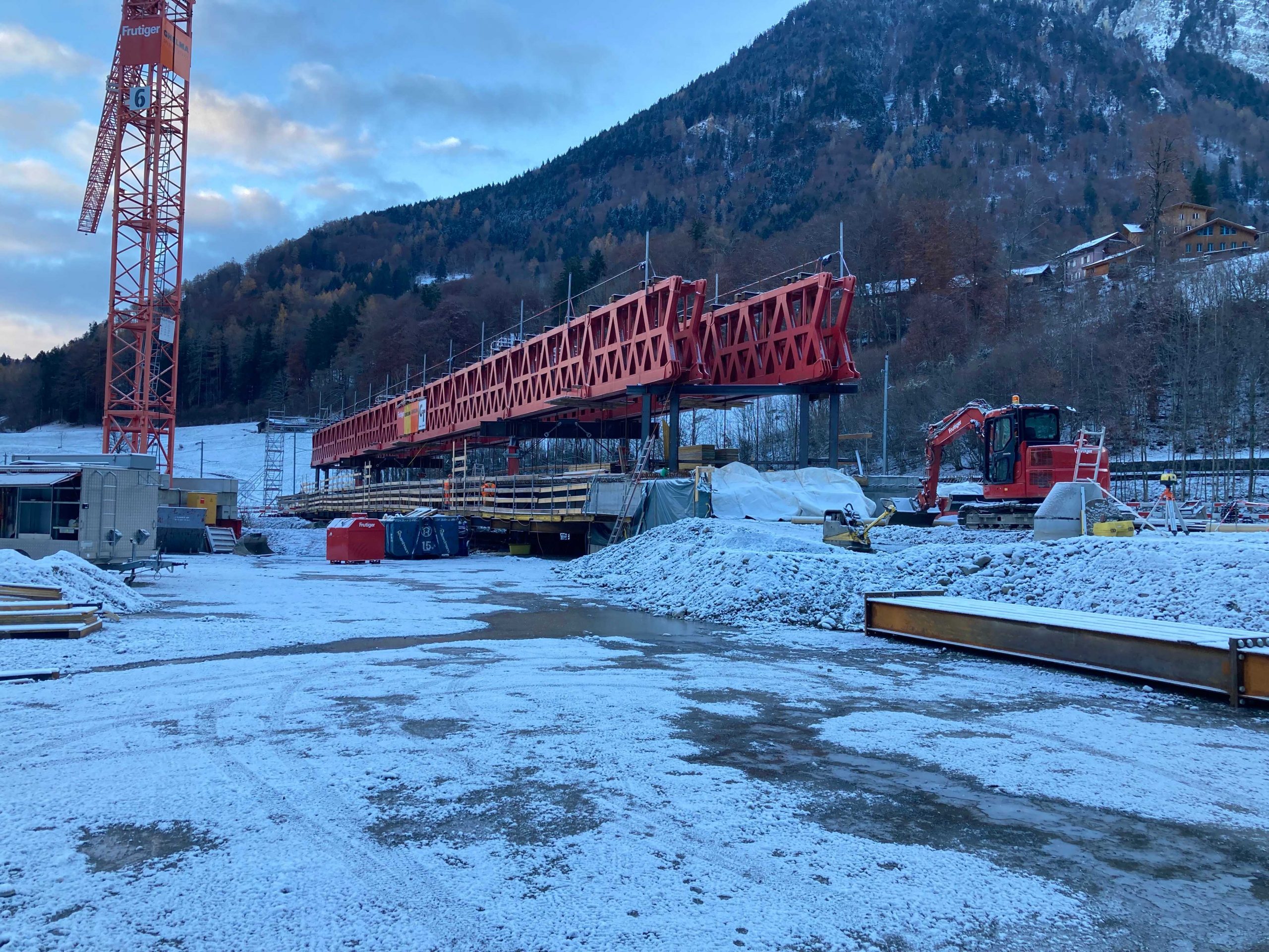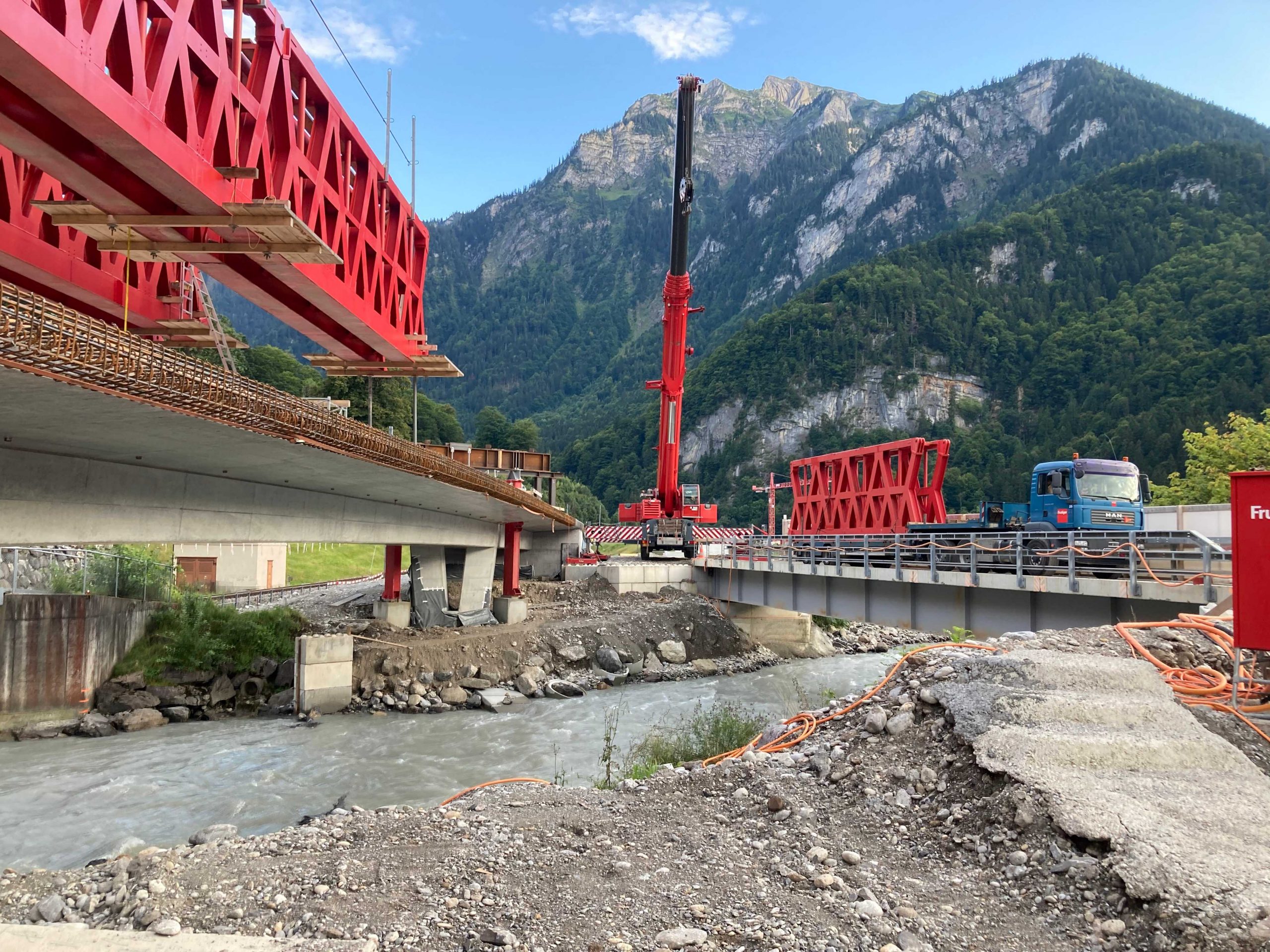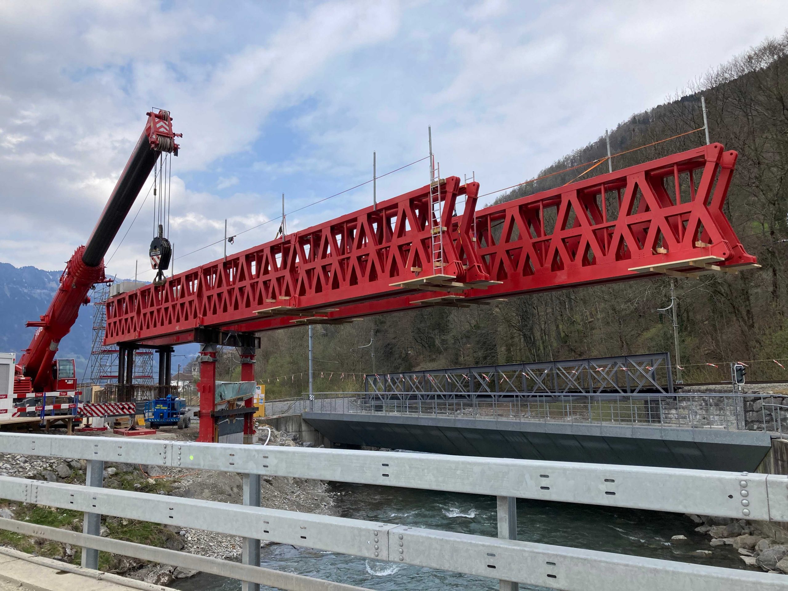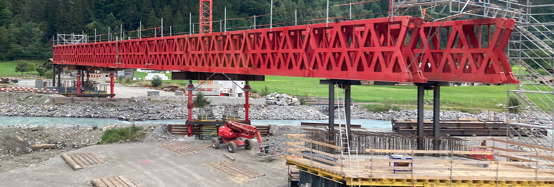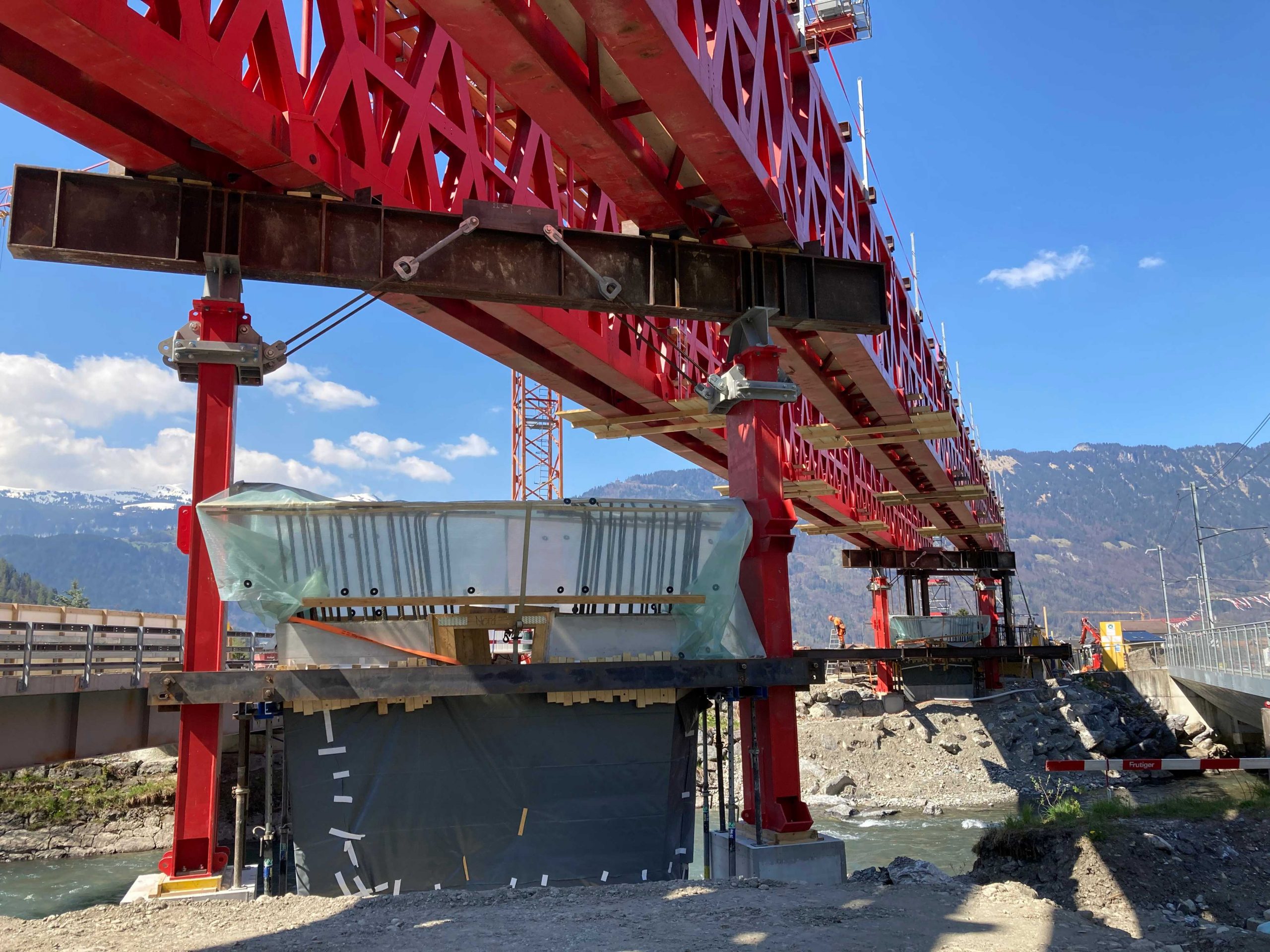 Für die Herstellung von 2 Spannbetonbrücken über die Lütschine im Zuge der Umfahrung Wilderswil in der Schweiz kam ein oben liegendes Lehrgerüst mit abgehängter Schalkonstruktion zum Einsatz.